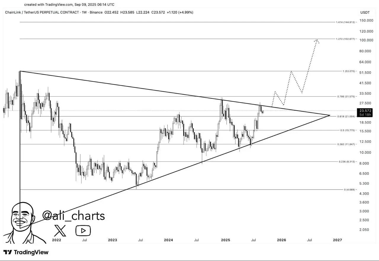 值得关注的阻力位在 24 美元至 26.50 美元之间。如果 LINK 维持在该水平之上,许多分析师认为 30 美元将是下一个现实目标。长期预测LINK 达到 100 美元如果继续采用 CCIP 和其他与 Oracle 相关的基础设施。