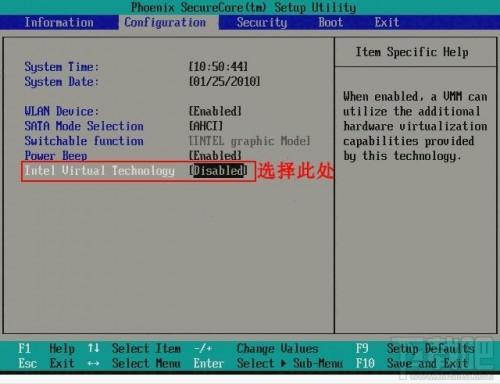 1、进入Configuration,找到“Intel Virtual Technology”把“Disabled”修改为“Enabled”;