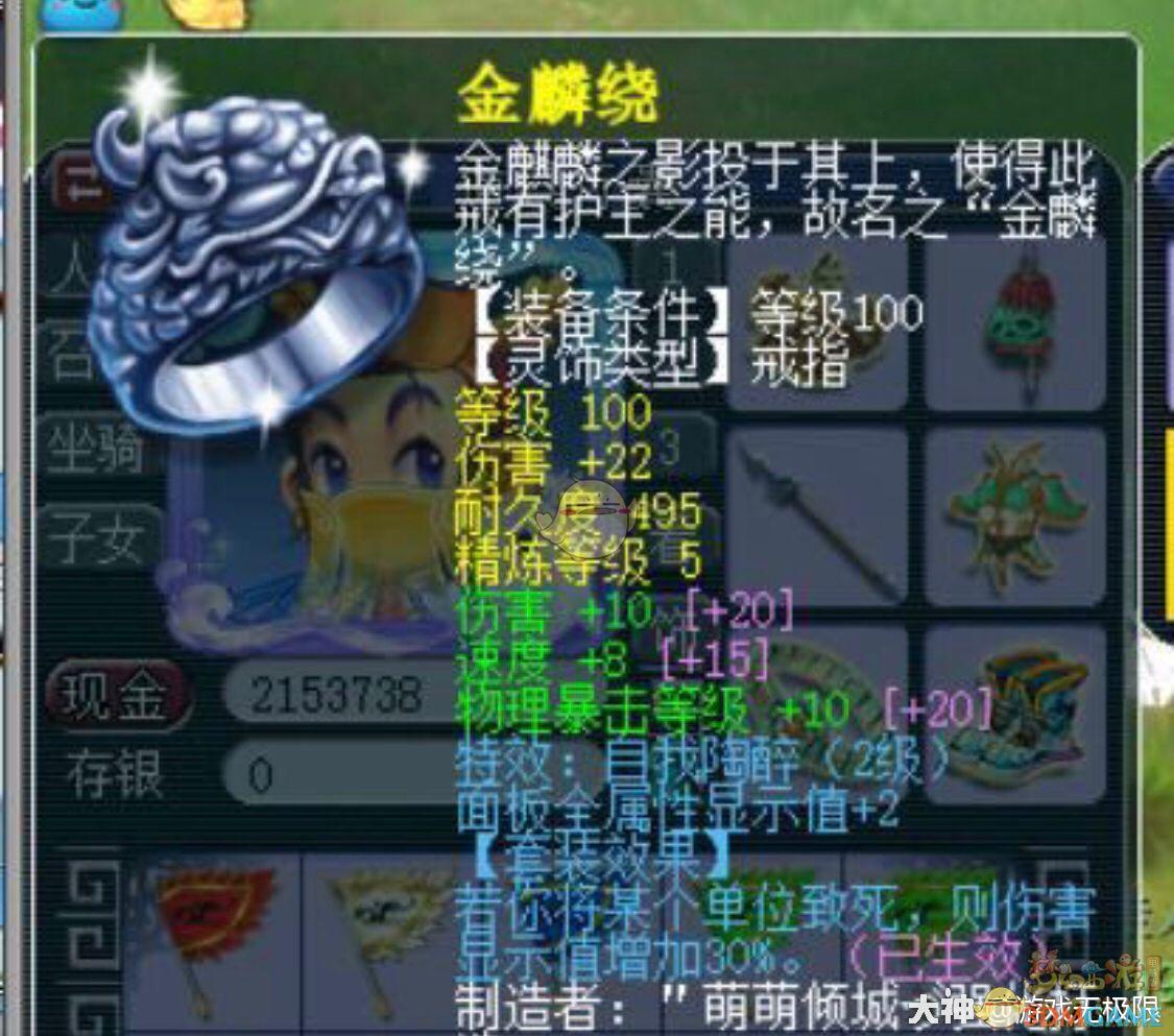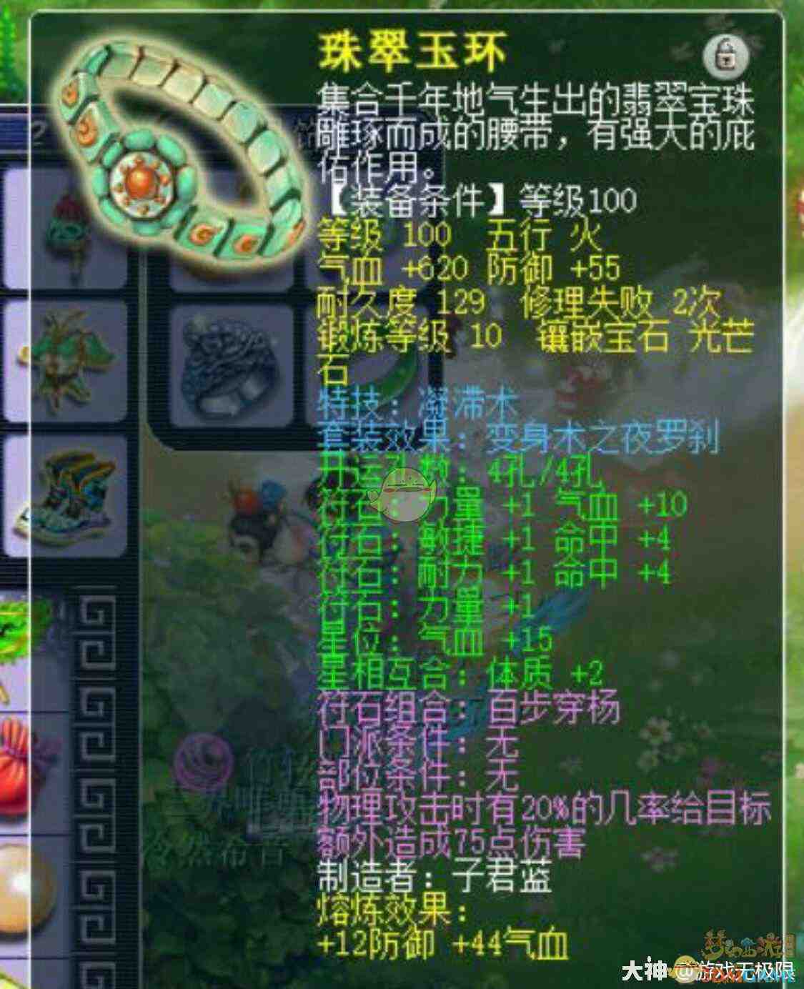 100级的腰带,10锻光芒石,熔炼后67的防御和664的气血,属性还可以,凝滞术的特技加上夜罗刹的套装,凝滞术的特技偏向辅助门派,点化物理套装,两者没什么关联,价格同样不会贵,而且还失败了两次。