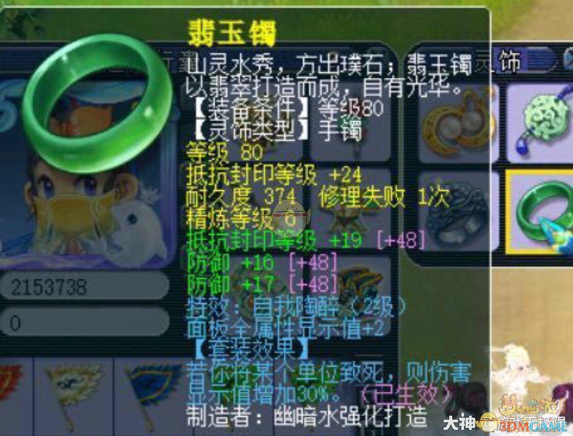 80级的手镯,主属性抗封,下排是双防御加上一条封印命中属性。