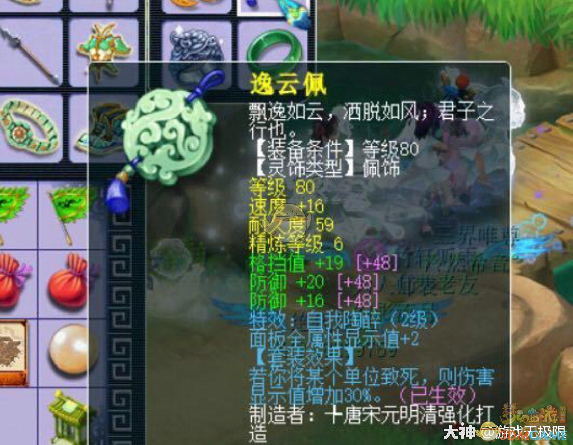 80级的佩饰,主属性速度加了16点,下排是双防御加上一条格挡值。