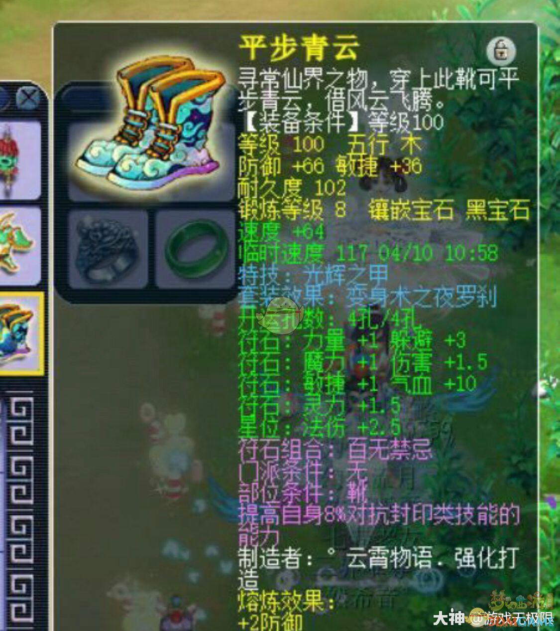 100级的鞋子,8锻黑宝石,熔炼后68的防御和36的敏捷,光辉之甲的特技和套装,同样是对不上的特技和套装,这种装备和之前的腰带差不多,基本不会太贵。