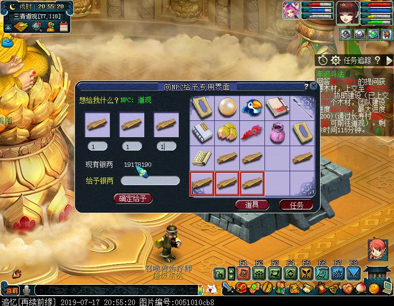 【副本进行】第一阶段建设道观:进入副本后与有个和尚(50,32)对话,开始第一环建设道观,场景内会随机刷新有个道人,单人答题,回答正确后获得木材,将木材上交到道观(87,109)可获得完成度,每个木材8点完成度,新副本迭代后玩家可选择上交400点完成度或者1200完成度,其中每个玩家最多缴80个木材。