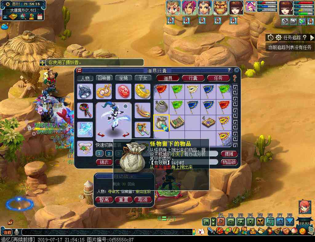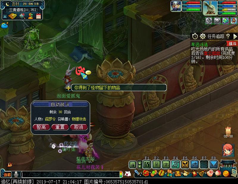 第四环:胜利后传入天宫场景,与有个神仙(50,18)对话随机获得求雨、坐禅、猜物中的一个任务。(此处小记是求雨)