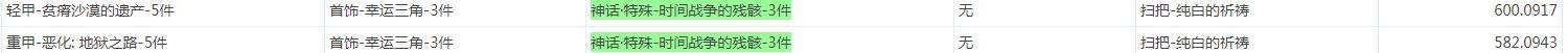 | 重甲-恶化: 地狱之路-5件 | 首饰-幸运三角-3件 | 神话·特殊-时间战争的残骸-3件 | 无 | 扫把-纯白的祈祷 | 582.0943 |