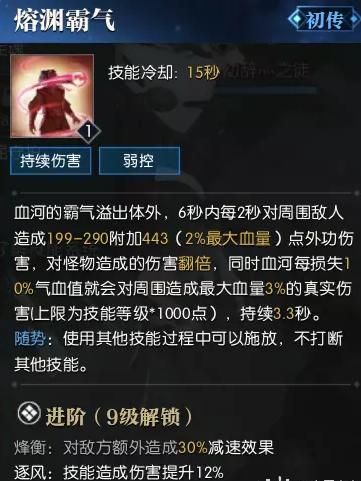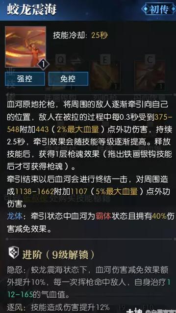 pvp核心技能,范围牵引控制,霸体减伤,且受血量加持,进阶后还附带吸血效果,部分pve玩法也适用,极致核心,很多战局血河蛟龙拉中多名敌人直接扭转战局。