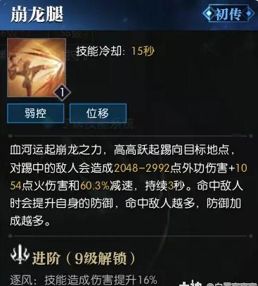 pve技能,降低敌人防御可叠加,只打挑刺穿插在连招前后取消后摇作用明显,不过需要控制的本可放弃替换蛟龙。