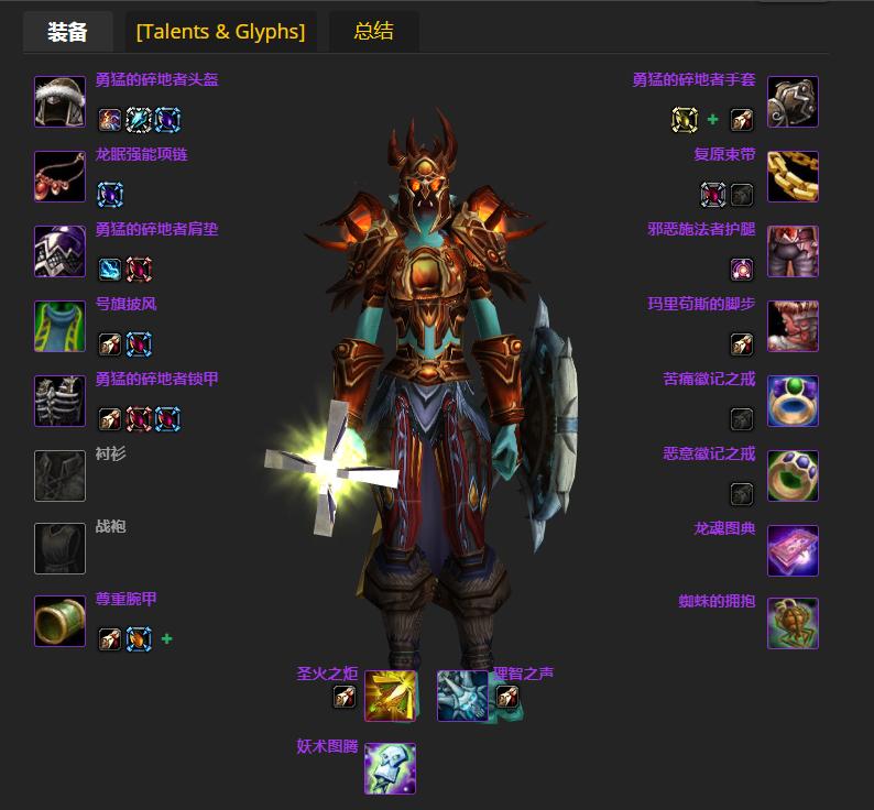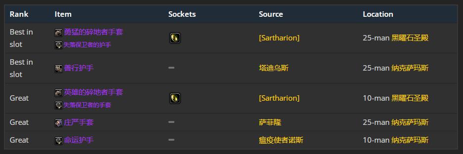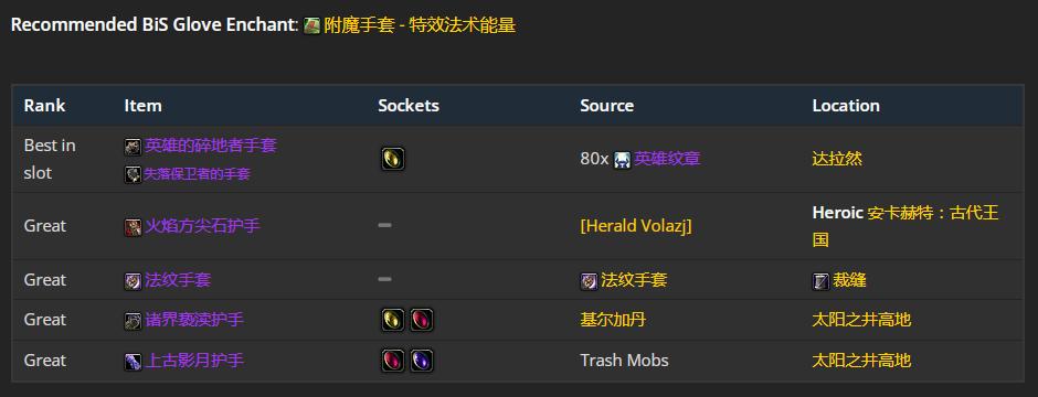 手套装备团本前的最优解是英雄的碎地者手套,P1阶段是勇猛的碎地者手套,附魔推荐附魔手套 - 特效法术能量