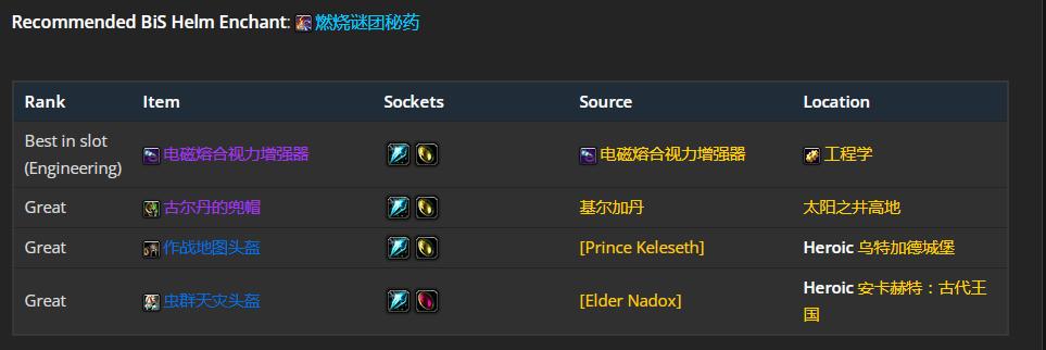 头部装备团本前的最优解是电磁熔合视力增强器,P1阶段是勇猛的碎地者头盔 ,附魔推荐燃烧谜团秘药