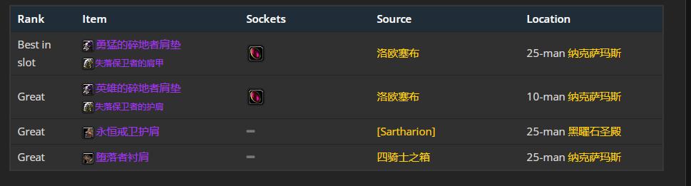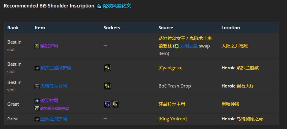 肩部装备团本前的最优解是爆发护肩,P1阶段是勇猛的天灾之心肩垫,附魔推荐强效风暴铭文