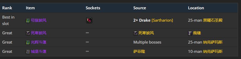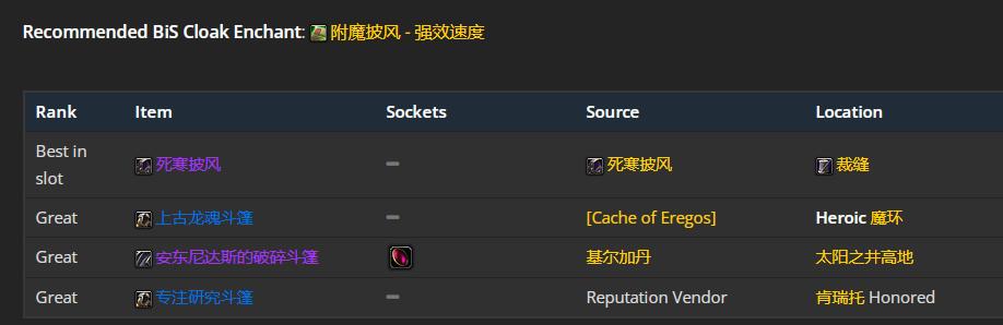 背部装备团本前的最优解是死寒披风,P1阶段是号旗披风,附魔推荐附魔披风 - 强效速度