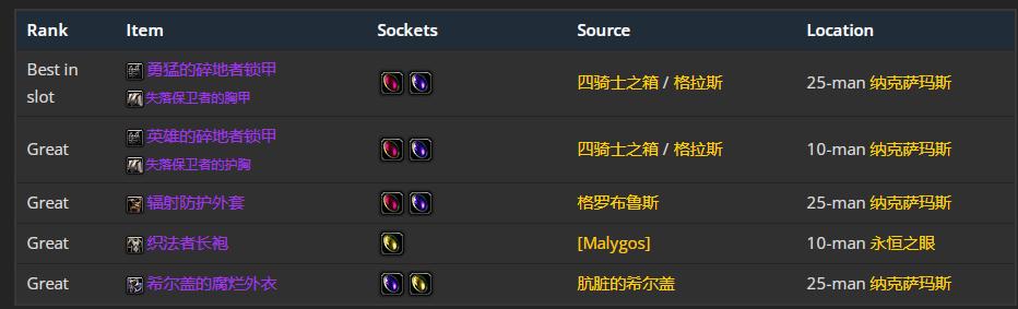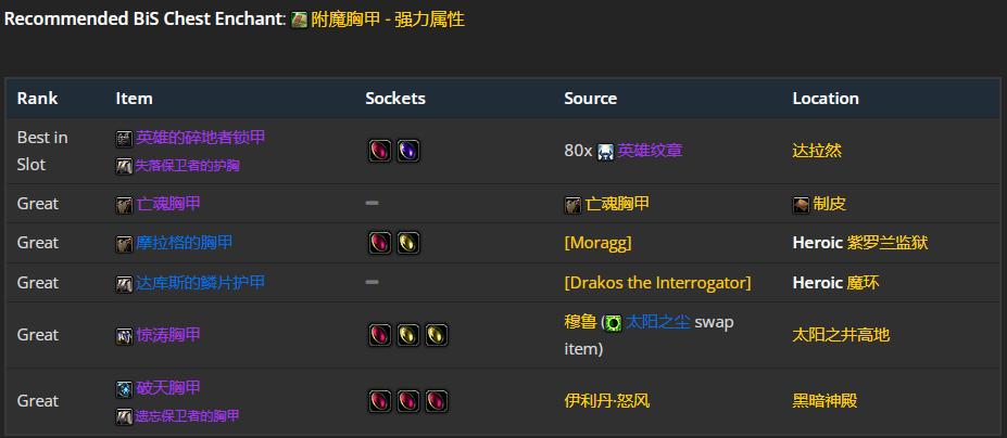 胸部装备团本前的最优解是英雄的碎地者锁甲,P1阶段是勇猛的碎地者锁甲,附魔推荐附魔胸甲 - 强力属性