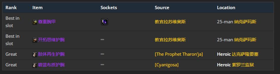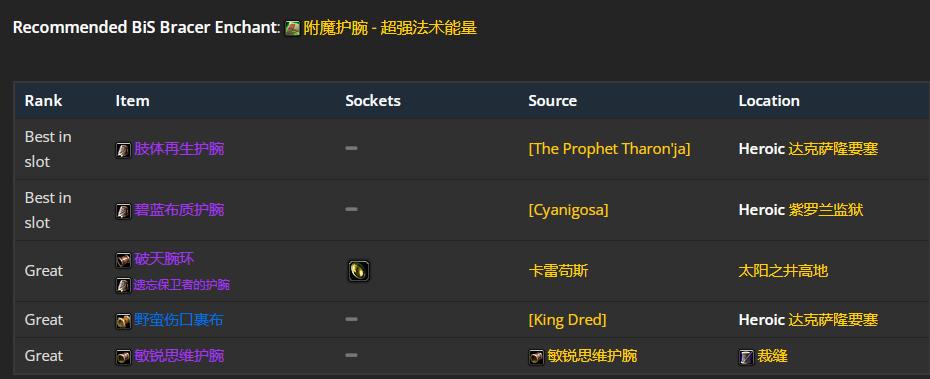 手腕装备团本前的最优解是肢体再生护腕,P1阶段是尊重腕甲,附魔推荐附魔护腕 - 超强法术能量