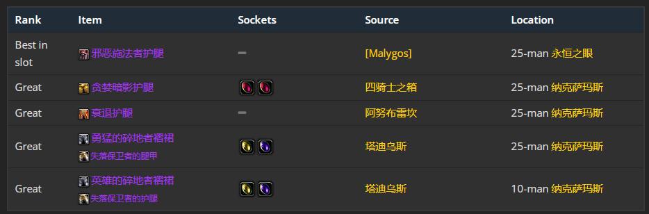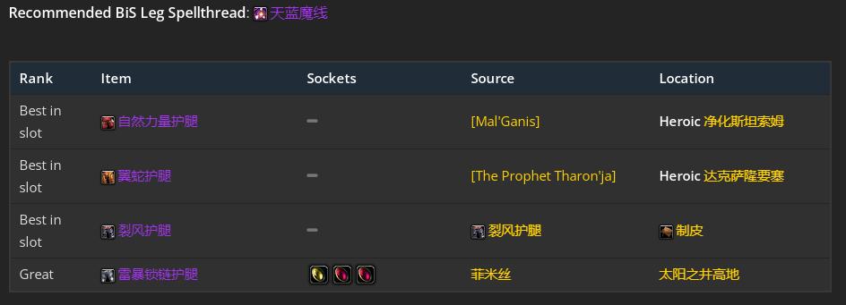 腿部装备团本前的最优解是自然力量护腿,P1阶段是邪恶施法者护腿,附魔推荐天蓝魔线