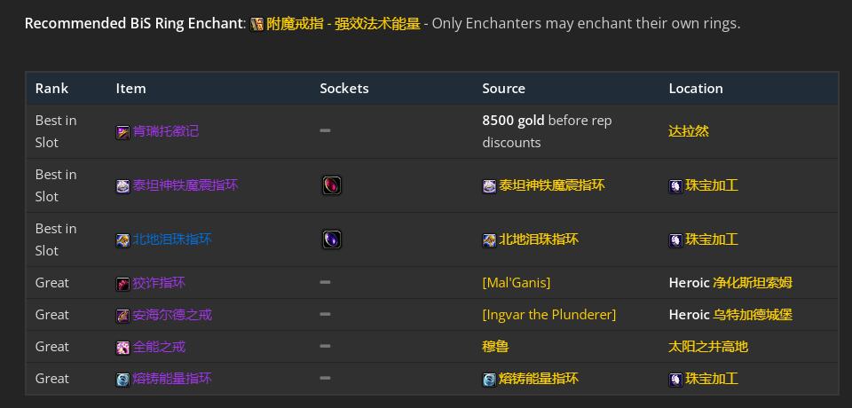 戒指装备团本前的最优解是肯瑞托指箍、泰坦神铁魔震指环,P1阶段是恶意徽记之戒苦痛徽记之戒,附魔推荐附魔戒指 - 强效法术能量.