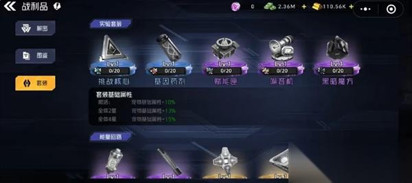 套装功能这里可以查看到不同的战利品组合的套装效果,套装属性可通过激活和升星操作进一步解锁强力的基础属性词条!