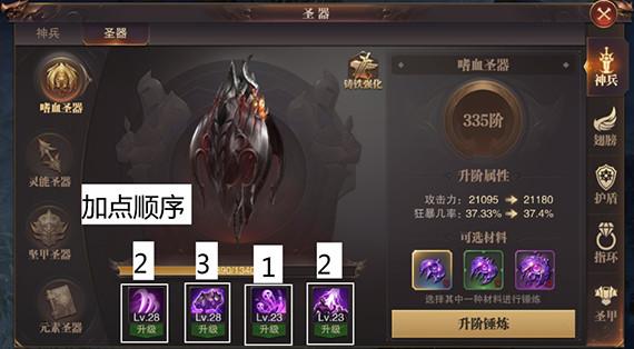 解析:嗜血圣器解封石在节日活动中大家可以获取,升级材料在日常礼包和活动中也可以拿到,作为第一个圣器栏的嗜血圣器,所有职业推荐优先提升第三层“嗜血灵佑:触发狂暴恢复百分比生命值”,其次第一层“嗜血恋战”和第四层“嗜血破军”同时平均提升,最后提升第二层“嗜血恃强”。