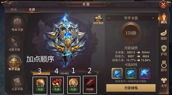 解析:为啥说坚甲是圣器中的核心呢,主要还是在于他的第三层“坚甲铁壁”带来的是PVP伤害百分比减少,这个属性一般只有在套装、大天使套装、圣装、指环这些珍贵装备中才会有,这个属性也是PK必备强大属性,那么我们推荐所有玩家优先提升第三层“坚甲铁壁”,甚至可以保留在未激活第三层的情况下保留必要材料,前面1-2层简单提升,后面主提升这个属性。综合一下坚甲提升顺序第三层“坚甲铁壁”、第四层“坚甲反击”、第一层“坚甲守御”、第二层“坚甲沸血”。