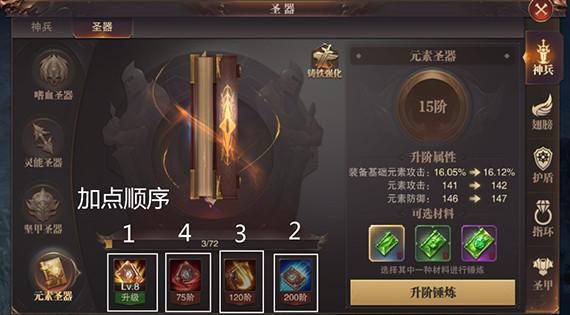 解析:元素圣器因为一直不受重视以及玩家在平时关于元素相关的装备、符文之语、天赋等都是最后做的选择,其实元素在天赋上在不断的做加强,但是元素无法一直陪同作战、作战能力较低导致很多玩家都不怎么重视肯喜欢元素板块,在这里元素圣器升级材料才是寥寥无几,简单的说一下综合加点顺序吧:按第一层“元素斩杀”、第四层“元素无双”、第三层“元素嗜血”、第二层“元素爆发”顺序提升即可。