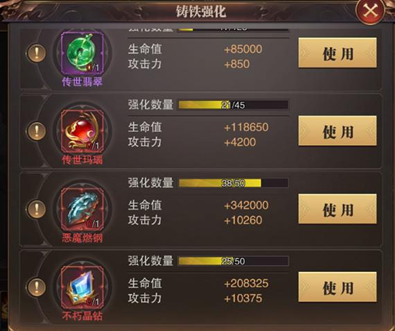 铸铁强化作为一个消耗稀贵材料提升角色生命值、攻击力、技能伤害从而提升战斗力的一个隐形平台,这里为啥说它是一个隐形的平台呢?平时其实很多玩家在疑问为啥装备一样,人家的战斗力就是比我高很多呢?其实除了人物角色的幻化系统中的幻化柜分解等级等多个地方隐形看不到,这里就是其中一个战力拉开差距的关键点,这个材料只有在平时幻化武器活动中可合理提升至满级,待角色等级提升或是系统修改这个铸铁数量上限后也会相应提升上限。