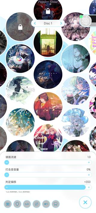 点击圆盘中心的播放便可以开始游玩了。此外要注意,当任意Note获得Miss判定时,屏幕会跳出灰色的长列效果(或者手指点击方位为圆心的扩散圆特效)和x,此时上方的计量条将减少,扣光时将直接退出本局并获得Not Clear评级。
