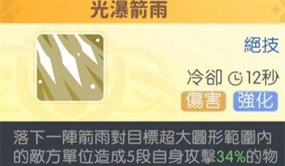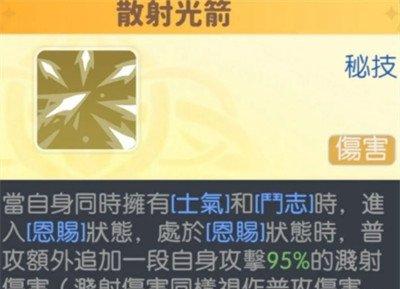 在特技方面,阿波罗的“散射光箭”能够在她同时拥有“士气”和“斗志”状态时,进入“恩赐”状态。在这个状态下,她的普通攻击将会额外追加一段溅射伤害,虽然无法暴击,但95%的攻击力溅射伤害可以大大提高她在群体战斗中的输出效率,帮助她快速清理敌方单位。