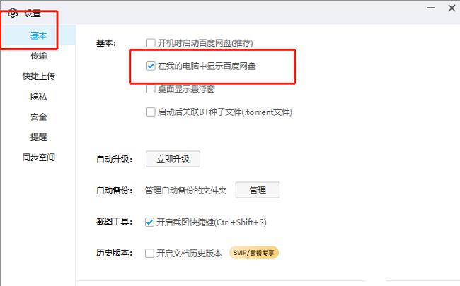 3、在打开的窗口界面中,点击左侧栏中的"基本"选项,然后找到右侧中的"在我的电脑中显示百度网盘",最后将其小方框给勾选上就可以了。
