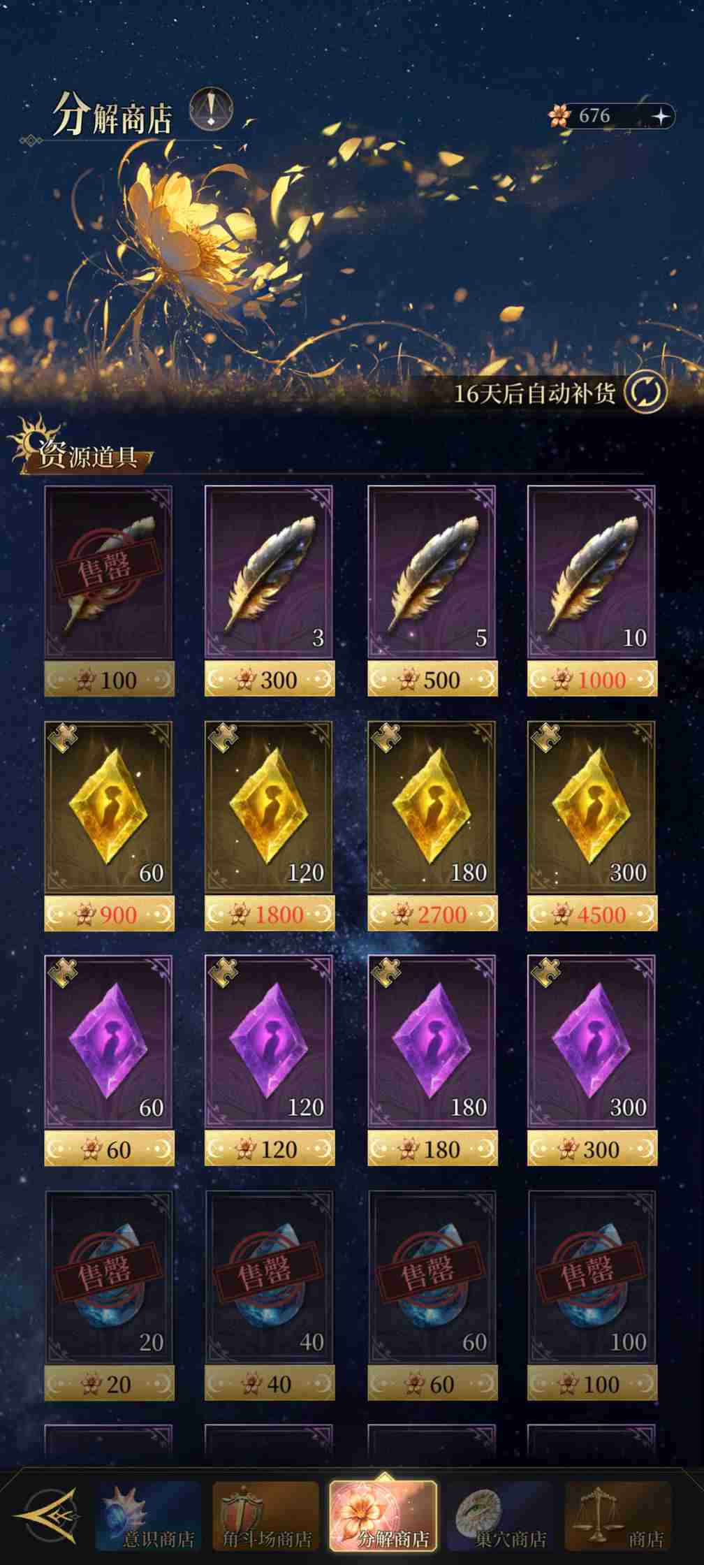 珍品栏的物品基本都是必买的,除了那个1000钻的自选红装备箱(为了冲榜冲进度的氪佬可以买),因为性价比极其不划算。资源道具栏一开始只有两行,一排都是固定30折扣普抽,原价金抽,20折扣的金碎片,原价紫碎片,后续推图3、4号位会更换成升神器的红黄水,二排1号位固定10w金币的预兆书,234号位随机折扣的金币/预兆书资源箱子,资源道具栏第一排第一个的30折扣普抽必买,第二排的全都无脑买满,其他都不建议买,买完建议每天再刷新3次左右也就是刷新到500钻的就停手,氪佬赶进度的可以把500钻的也刷了。能买红黄水以后赶进度的话可以买点钻石的红黄水,如图