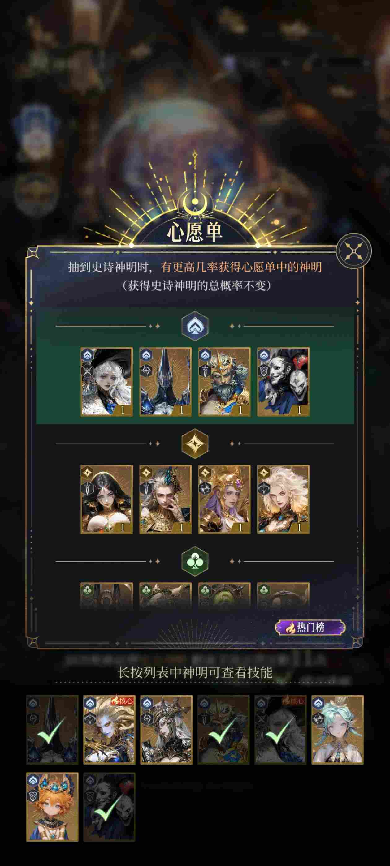 黑桃个人推荐赫卡忒(黑桃大C,巢穴必上,推图神器10级启用,目前前期略微乏力,中后期依旧是推图大C),波塞冬(不用多说,你游唯一真神,前提是10级神器以后,没开10级神器以前太乏力,神龛也能用),磨磨斯(不死,群体嘲讽,回血,四系最硬坦之一,神龛也能用),涅墨西斯(前期开荒用,中后期竞技场用,因为三相被削过,所以巢穴也得上),海拉美杜莎都是后期四五队的C,海拉绑女娲强度应该还是可以的