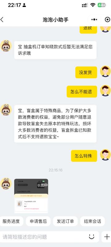 1 月 2 号,我满心欢喜地在泡泡玛特抽盒机买了 crybaby 系列,本想着坐等可爱的娃到家,结果左等右等都没发货。我就不想要了,就申请退款,结果商家直接不同意。