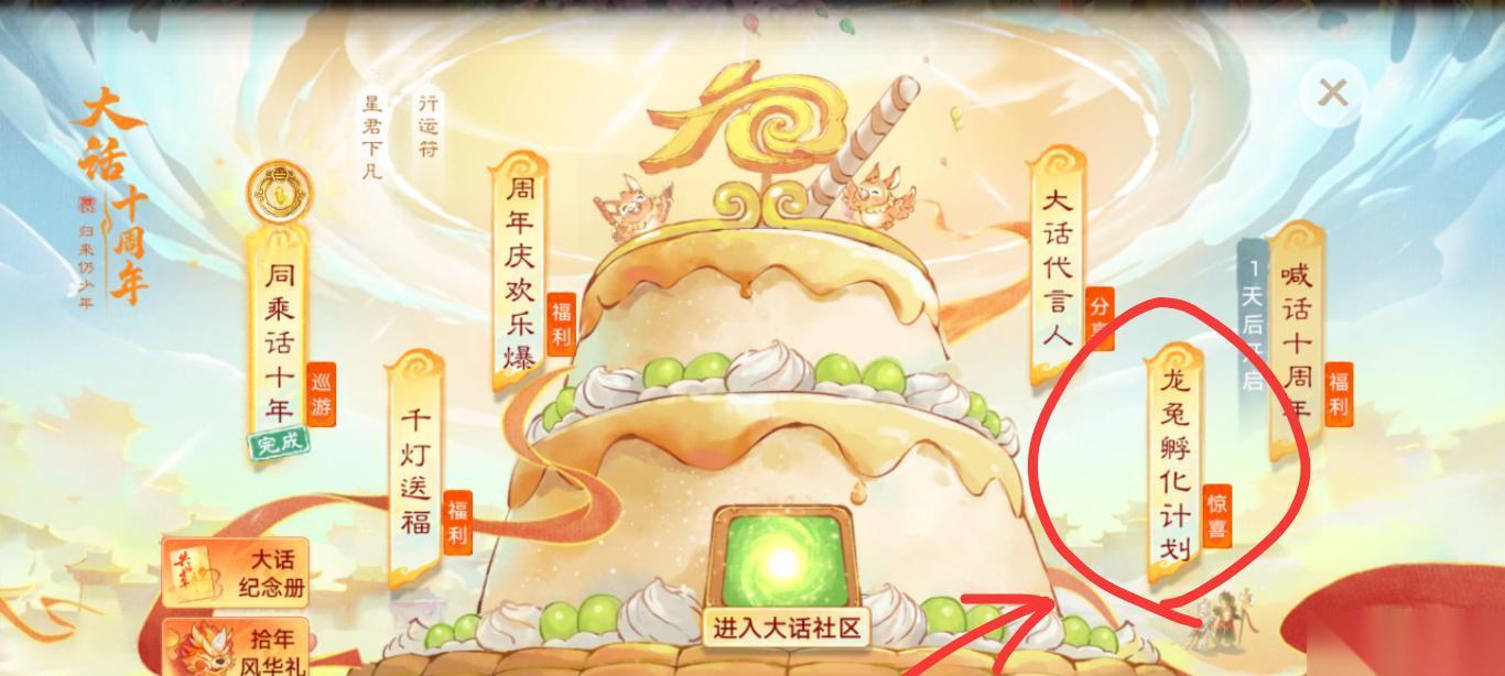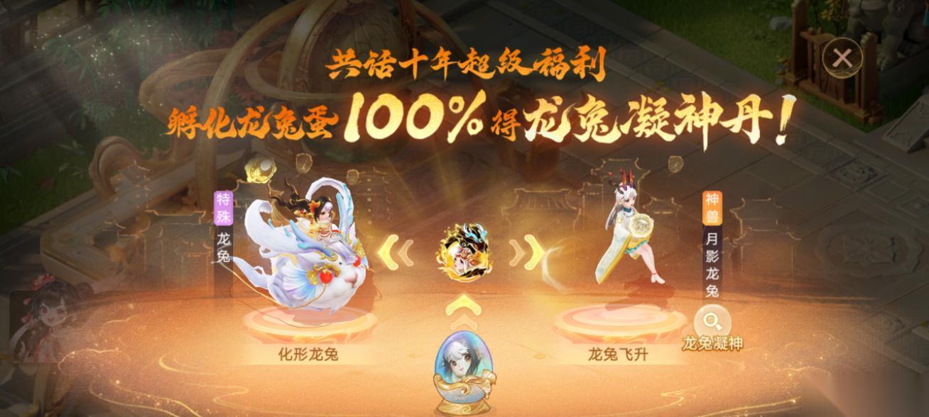 只要上线游戏,点击左上角【大话十周年】,看到龙兔孵化计划,点进去就能跟叶子猪一样,轻松获取一枚龙兔蛋!9月15日至10月9日,登录大话西游手游都可以领取,完成龙兔蛋孵化任务即可100%获得一枚龙兔凝神丹。