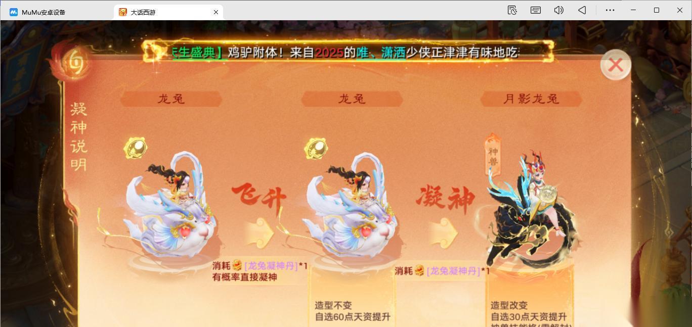 因为有些玩家是有龙兔的,所以官方贴心设置了2个选项,可自由选择化形永久特殊召唤兽龙兔,或将已有龙兔飞升进化为神兽月影龙兔!具体龙兔怎么培养,大家可以搜索“叶子猪大话手游”前往专区了解更多攻略。