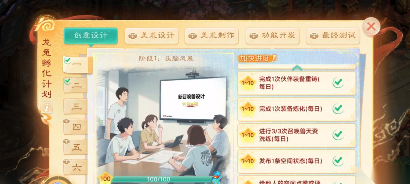 叶子猪从龙兔孵化计划页面,五个流程(创意设计、美术设计、美术制作、功能开发、最终测试),每个流程有六个阶段,可以粗略计算出,大话手游龙兔蛋孵化,最少需要30天,也有一些玩家表示25天就可以完成。