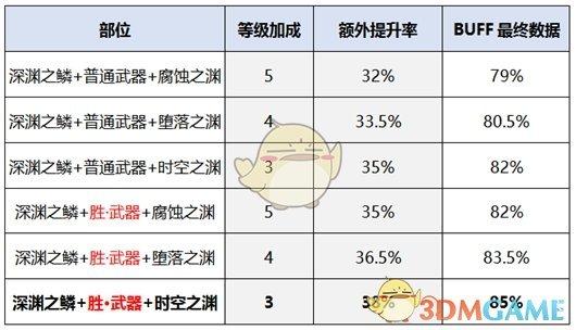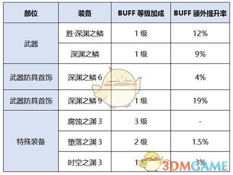 (2)换装搭配新换装以深渊之鳞9件套(防具5+首饰3+武器1)为基础,之后视个人情况选择不同的特殊三件套进行搭配。新传说换装自带BUFF等级加成,相比异界与绿气息换装达成完美的难度降低。以完美换装为例,装备自带3级BUFF,计算时装、宠物、光环、称号4级后,再堆3级即可完美,相比完美异界换装需要的6级成本降低。下表为不同搭配的装备带来的等级、额外提升率。【深渊之鳞+胜·武器+时空之渊】为完美换装。