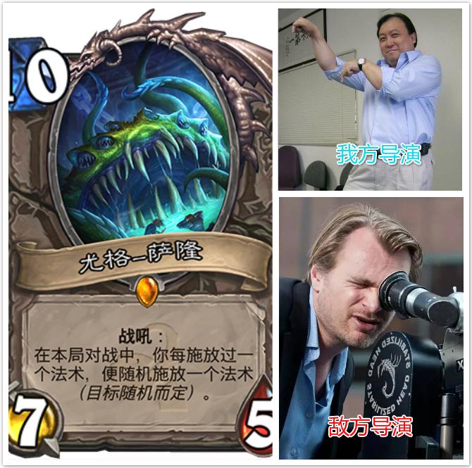 首先介绍的是我们大名鼎鼎的导演--尤格萨隆,曾经在上古之神低语版本初期可谓是呼风唤雨,没有他翻不了的盘,管你多大的优势,只要萨隆还在手,就还有翻盘的可能。萨隆的上限下限算得上是炉石传说中差距最大的了,没有之一,在对方手里起手一发圣疗术回血加补充手牌,接着一发照明弹清光敌人的奥秘,然后扭曲虚空清光场面,最后一发召唤兽群,吹响反攻的号角,反观,在自己的萨隆就完全不一样,什么疾跑接星界沟通,炎爆术砸自己脸,迈拉的不稳定元素掏空自己牌库,只怕自己还死的不够快。