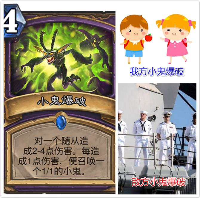 小鬼爆破是一张非常实用又强大的术士四费法术,造成伤害的同时,还能召唤一定数量附带恶魔属性的小鬼。小鬼爆破总体来说还是非常看脸的,毕竟欧洲玩家可以完美解碧蓝幼龙,同时还能召唤四个小鬼,反观,如果像本小编这种非洲人用的话,只能用来解解酸性沼泽软泥怪,而且只能召唤两个可怜兮兮的小鬼,战斗力差了不止一点两点。