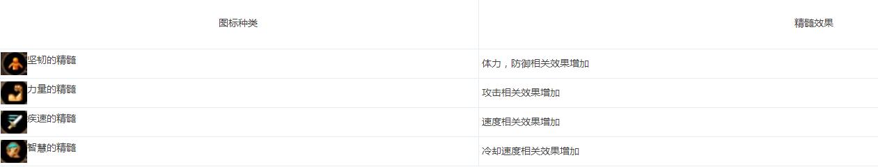 * 游戏里存在4个效果不同的精髓。每个精髓都具有经验值和等级,根据等级给予不同效果。