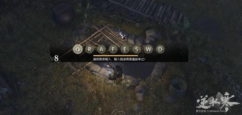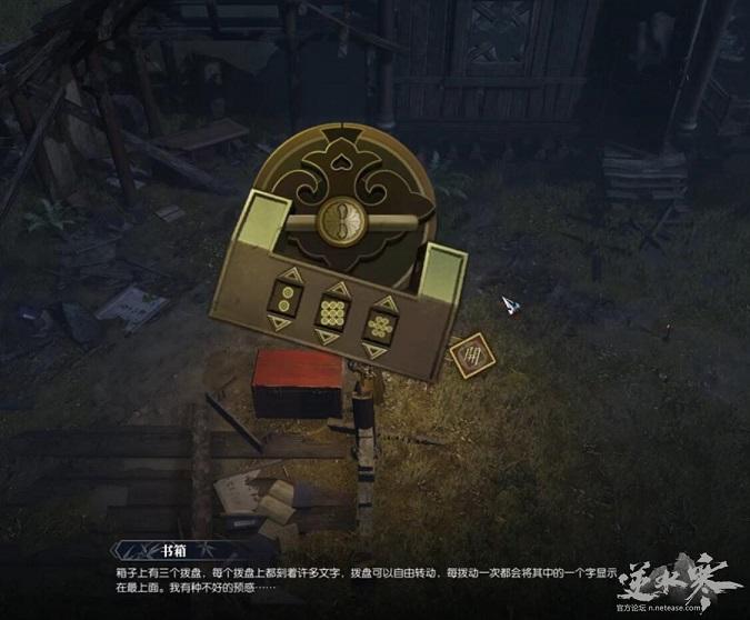 使用绷带缠绕断掉的烛台,加入火油,加短棉线点燃获得新线索,检查地上镇纸获得镇纸,检查尸体获得毛笔,附近见到手抄本,使用小刀划开镇纸获得薄木片,组合火油,和无情对话帮忙点燃高架灯笼,翻找箱子获得硝石,再次翻找箱子获得药锄,再次翻找箱子获得蜡烛,药锄锄开地面找到蚯蚓,将鱼竿挂上蚯蚓,去井里钓鱼,此处有qte,结束获得鱼,拿鱼去喂猫,获得项圈,项圈上有密码,对应手抄本的数字,前面是页数,后面是第几个数字,得到密码开启箱子,获得硫磺,用毛笔逗猫获得逗猫草