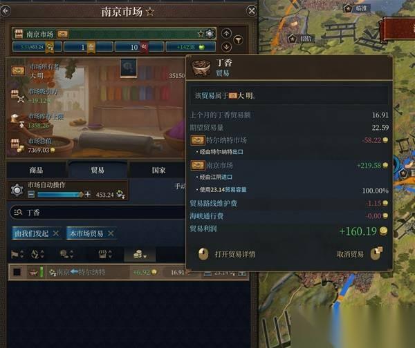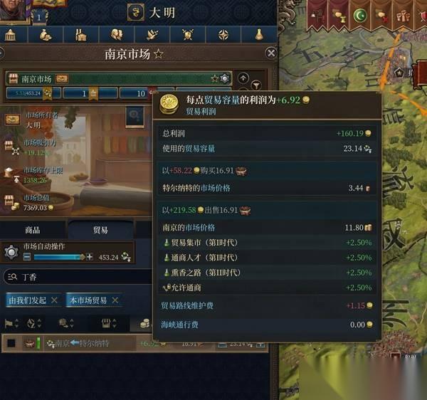 一共从香料群岛进口了16.91的丁香,售价减去进价减去贸易维护费,最后算出来总利润是160.19,非常可观,然后乘以当下的王室力量37.44%,得出一个59.975的数值(四舍五入为59.99)。