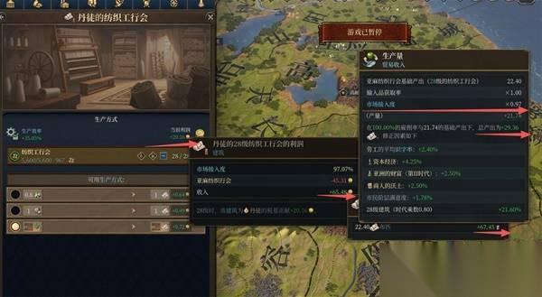 那么,想要在火星人的压力下抢回来利润,只能生产效率了。上图可以看出,虽然丹徒的市场接入度0.97影响了实际的建筑产出(同比影响原料的投入量),但是在我28级建筑带来的21.6%规模效应(这里倒确实是v3)和其它杂七杂八的加成下,我还是生产了比28个分散的纺织工行会更多的布匹。